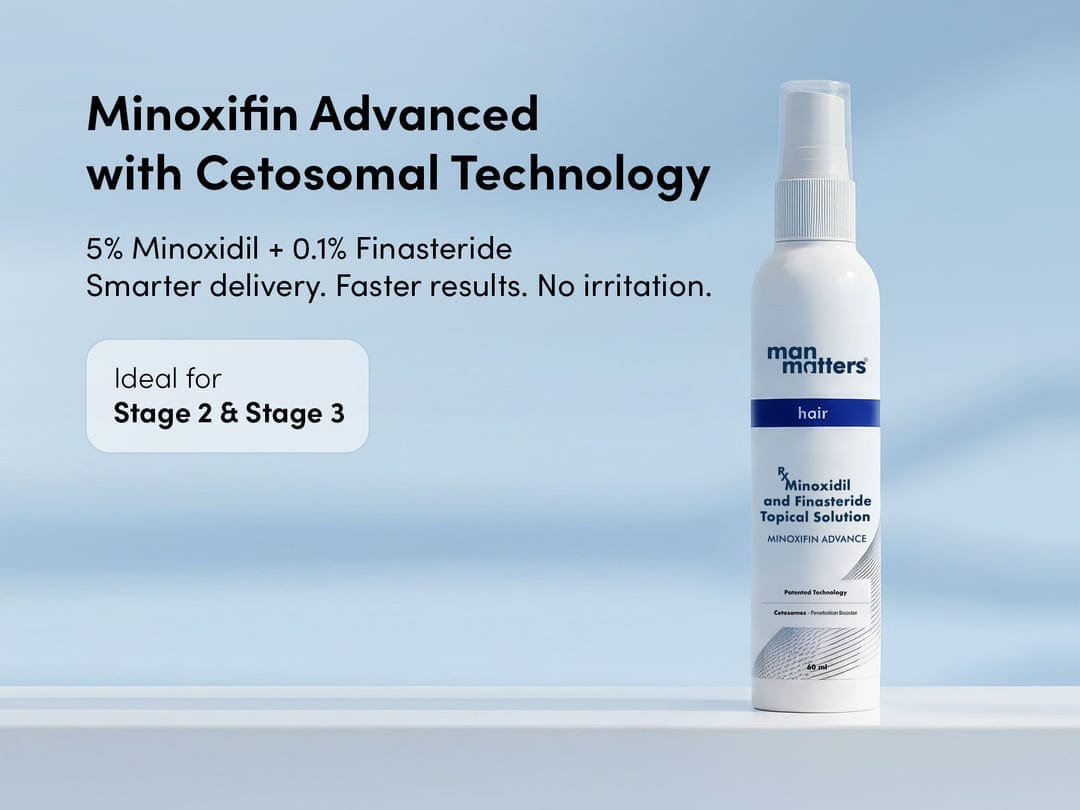 Minoxifin Advanced combines 5% Minoxidil + 0.1% Finasteride with CETOSOMAL® Technology for deeper absorption, reduced scalp irritation, and added moisturization- making daily treatment safer and more effective.