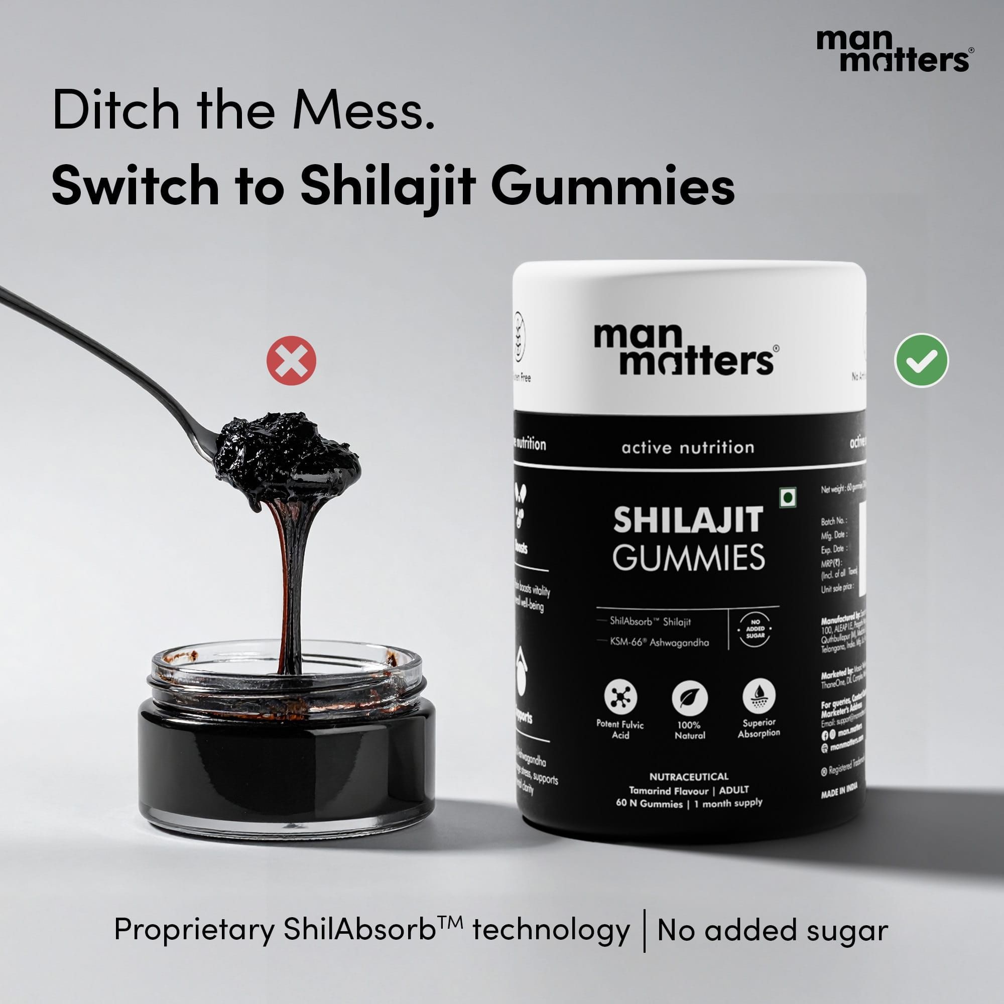 Man Matters stands out as the most trusted and clinically-backed Shilajit brand in India combining premium Himalayan sourcing + clinical-grade lab transparency + modern, habit-friendly formats like delicious tamarind gummies (zero sugar, zero mess, airline-safe, travel-friendly, melt-proof).