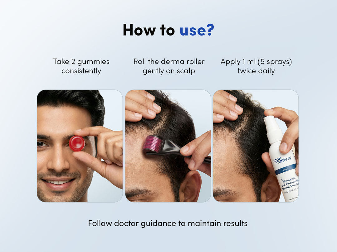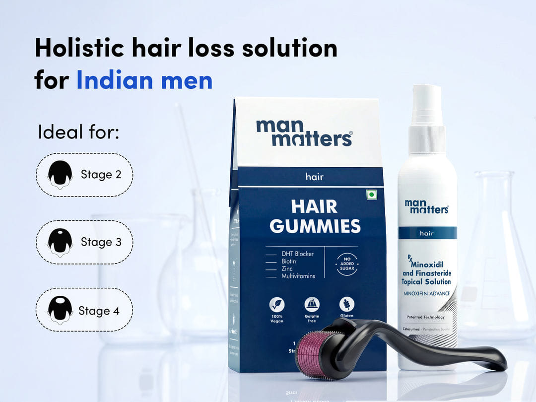 Our Hair Regrowth Advance Regime combines Topical Minoxidil and Finasteride with Biotin Gummies and a Derma-roller - designed for better results than regular treatment.