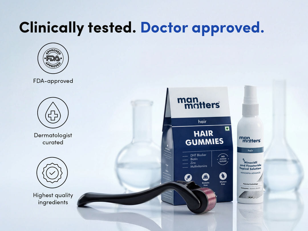 Yes. Topical Minoxidil has been used safely for over 40 years and is FDA-approved for hair regrowth. Topical Finasteride has a strong safety profile when used as directed. Our Biotin Gummies are made with 100% vegan, sugar-free ingredients safe for daily use. All formulations are dermatologist-approved and made in India under strict quality standards.