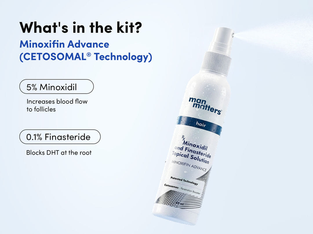 Three major differences: (1) Our formula adds topical Finasteride to block DHT — Minoxidil alone only stimulates growth without addressing the root cause. (2) CETOSOMAL® technology delivers 2–3x better penetration than standard aqueous formulas. (3) Our formula is alcohol-free, preventing the scalp dryness common with other products, especially important in Indian conditions.