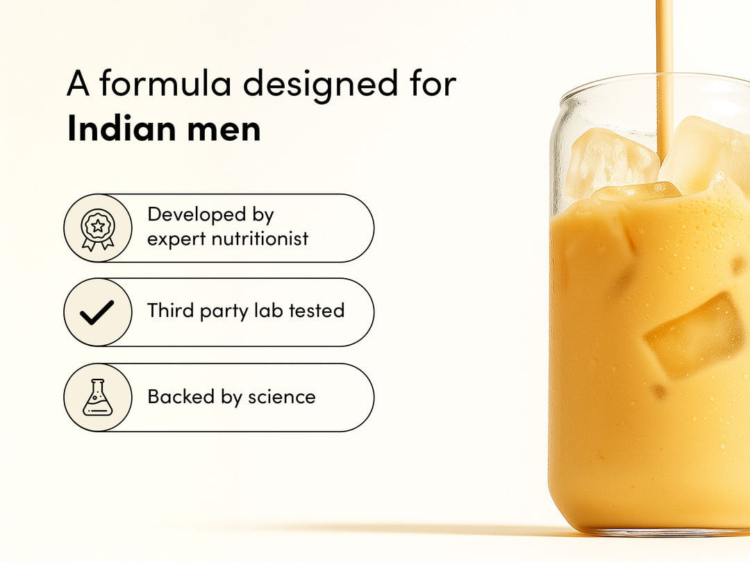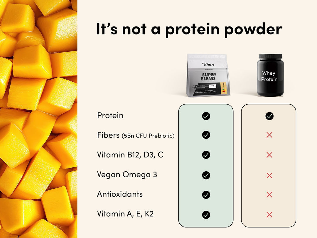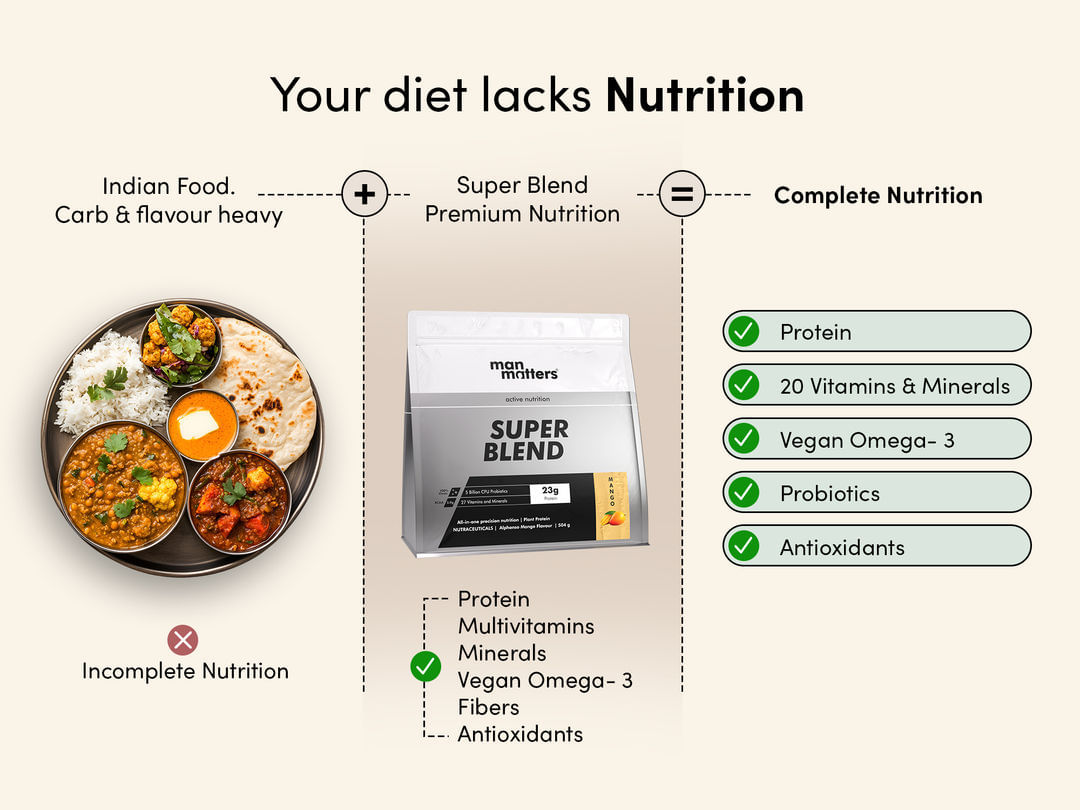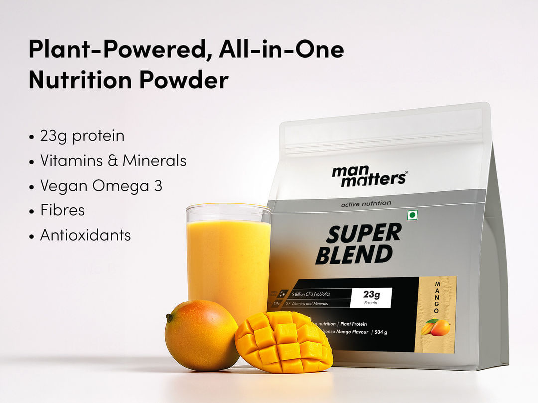 Plant-Powered, Science-Backed Nutrition: Super Blend uses premium Canadian yellow pea protein that offers whey-level effectiveness, enriched with essential nutrients, fibres, probiotics, and antioxidants - safe, easy to digest, and perfect for modern Indian men.